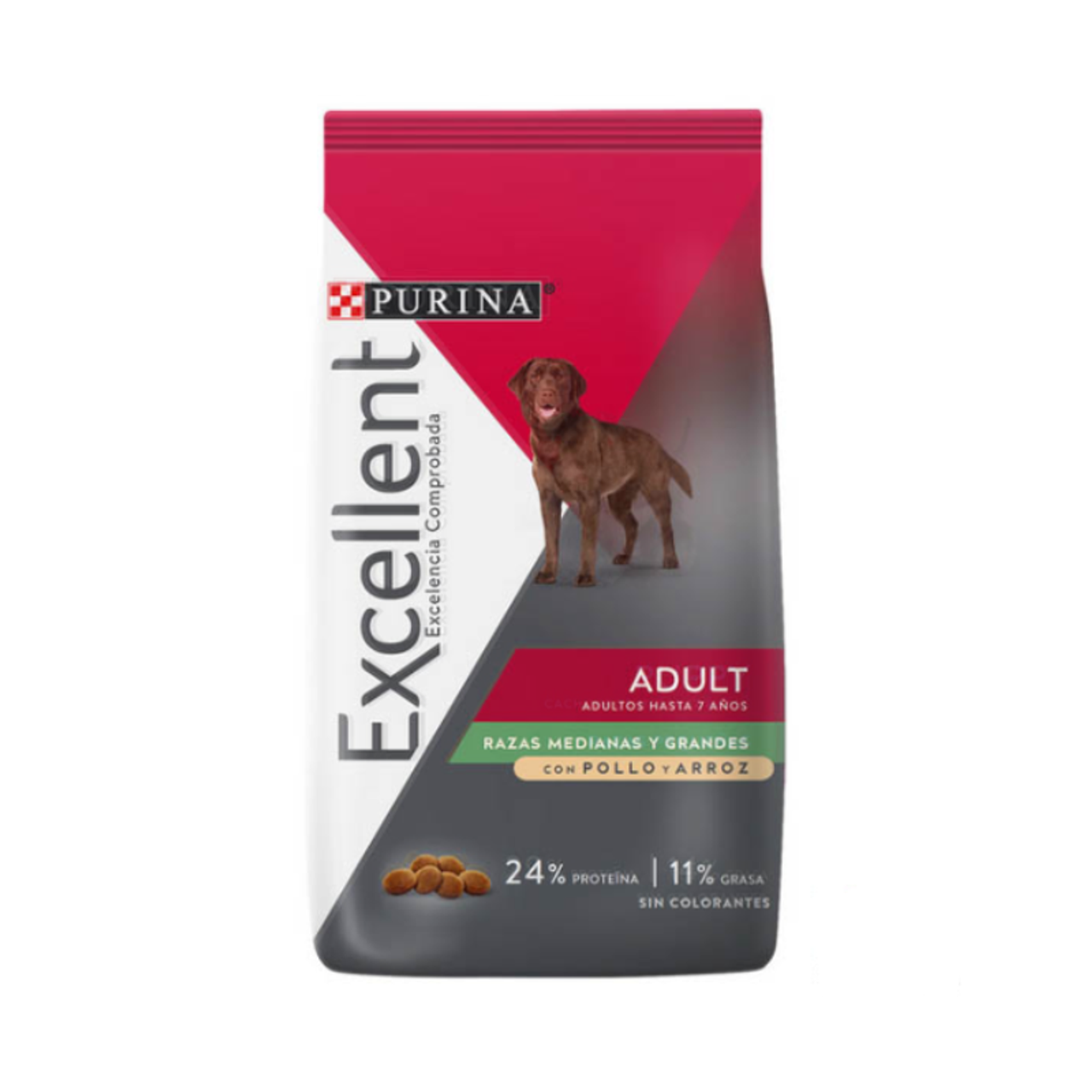 Los perros adultos tienen diferentes necesidades nutricionales que los cachorros o los perros maduros. PURINA® Excellent® ADULTO POLLO Y ARROZ RAZAS MEDIANAS Y GRANDES ofrece una fórmula completa que incluye aminoácidos esenciales, inulina, vitaminas, minerales y zeolita, aportando un óptimo balance nutricional y un sabor irresistible